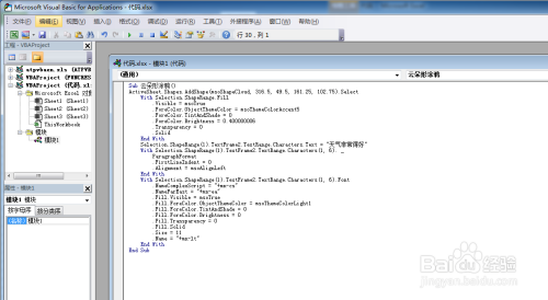 5.在VBA编纂界面,写入指定的VBA代码,然后点击封闭按钮。