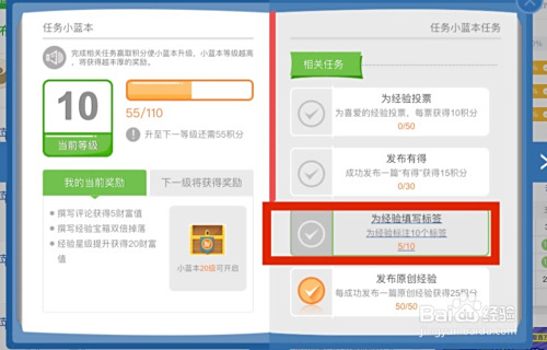 升级小蓝本到十级后需要为经验填写标签,怎么才能添加标签?