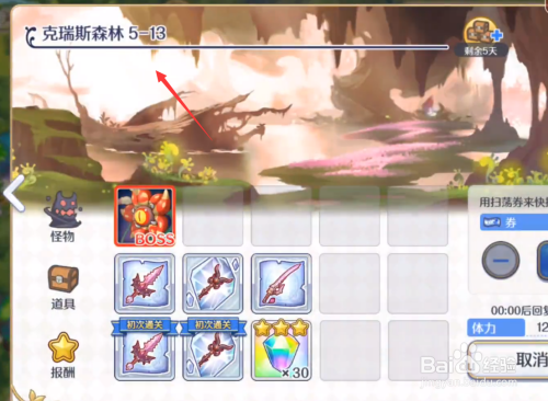 1、点击5-13进入战斗界面,这一关的怪就是防御高,血厚。