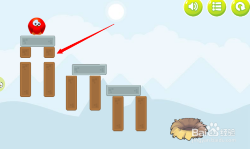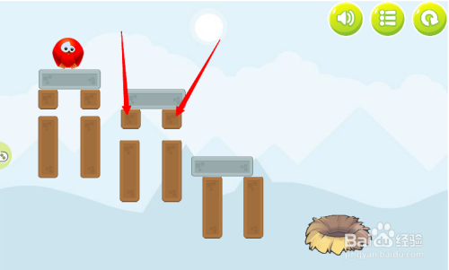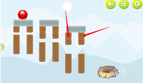 第三步:按照红色箭头,断根右边石头下第一组木块。