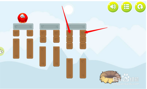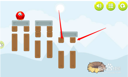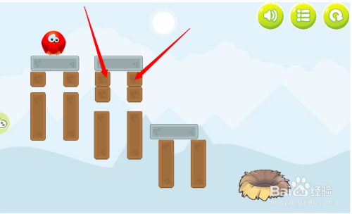 第四步:按照红色箭头,断根右边石头下方,第二组和第三组木块。