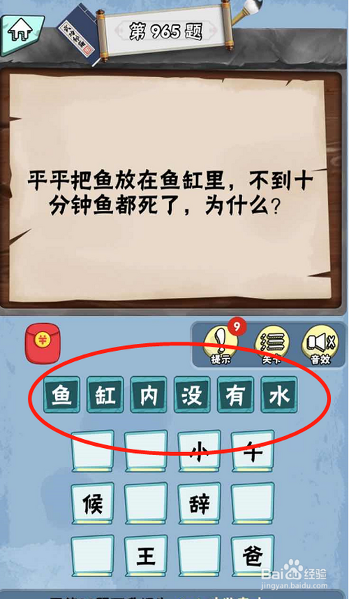 脑子急转弯达人游戏Lv5诺奖得本家儿965关内,提问平平把鱼放在鱼缸里,不到十分钟鱼就死了,这是为什么。