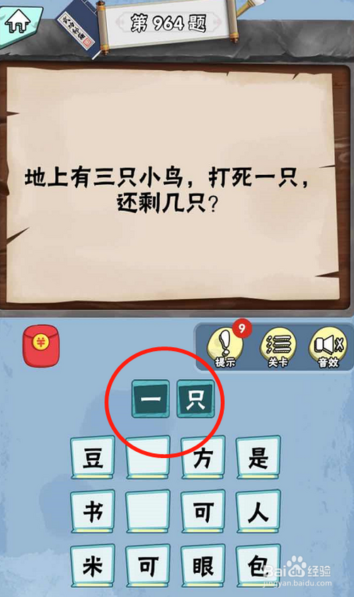 脑子急转弯达人游戏Lv5诺奖得本家儿964关内,提问地上有三只小鸟,打死一只,还剩下几只。
