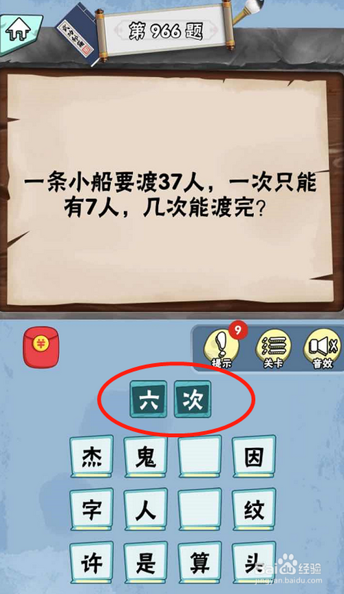脑子急转弯达人游戏Lv5诺奖得本家儿966关内,一条划子要渡37小我,一次只能有7人,提问几回能渡完。
