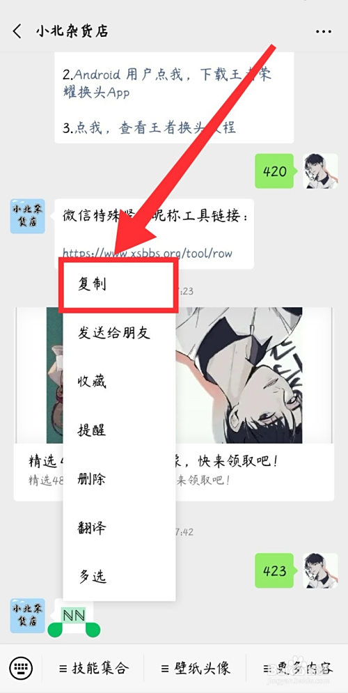 标的目的【小海说神聊杂货店】发送【423】,获得这两个特别符号,再长按复制到粘贴板上。