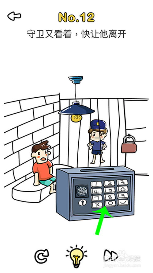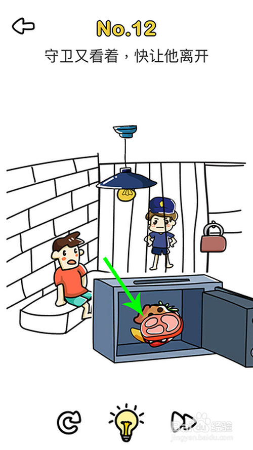 2.进入12关后,单根手指标的目的右滑动暗码箱,打开后,将食物给门卫,门卫走后,通关。