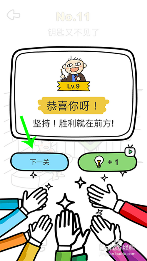 起首,点击11关进入,自右标的目的左滑动门卫,点击门卫背后的钥匙通关,再点击下一关。