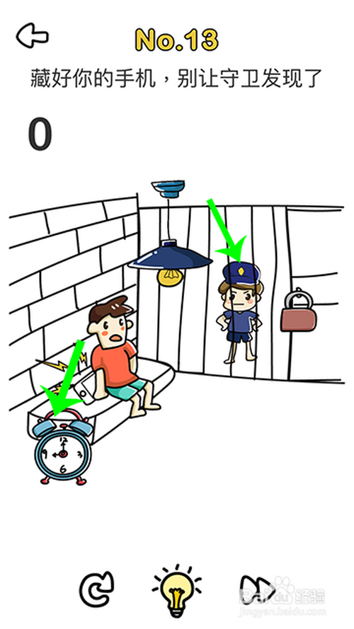 3.进入到13关,将闹铃上的铃铛,放到门卫头上做耳机,通关当作功。