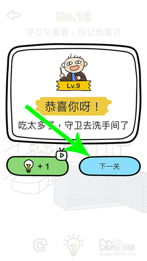 进入12关后,单根手指标的目的右滑动暗码箱,打开后,将食物给门卫,门卫走后,通关,点击“下一关”。