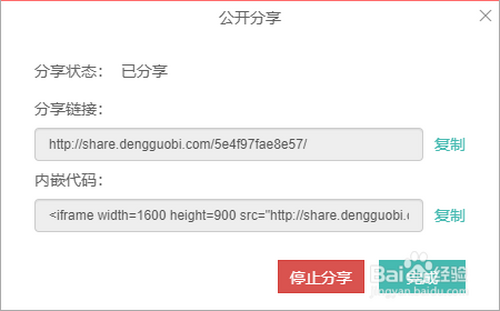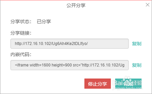 分享完当作之后会主动生当作分享链接和内嵌代码,点击“复制”可以复制内容。