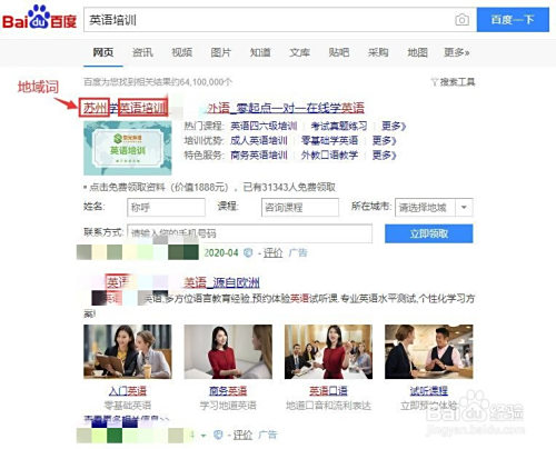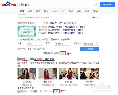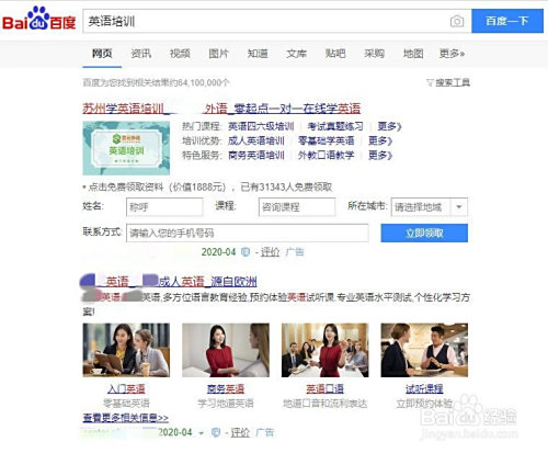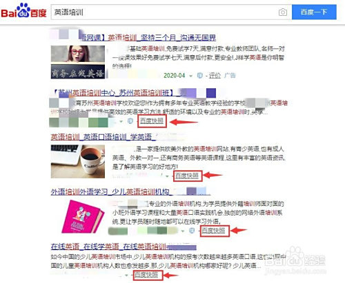 以百度搜刮“英语培训”为例,我们可以看到以下搜刮成果。