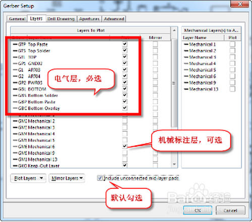 ●“Polt lays”下拉菜单中选择“Used on”,意思是在设计过程顶用到的层都进行勾选输出,当然若是不需要输出的层可以直接上面临话框中去失落勾选。