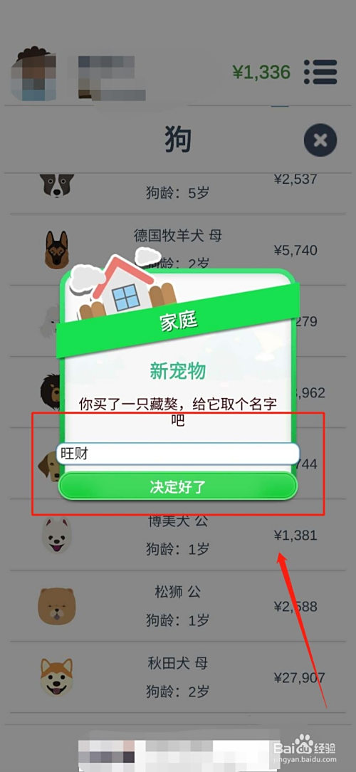 5.选好后点击采办,然后给宠物取名字