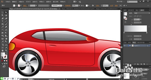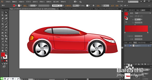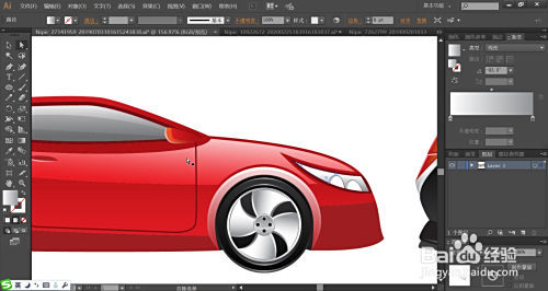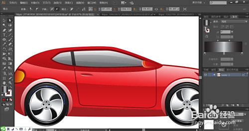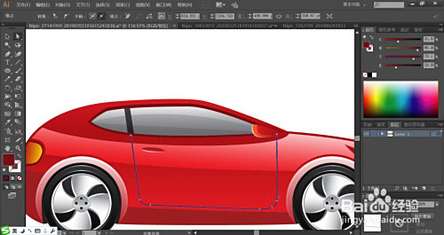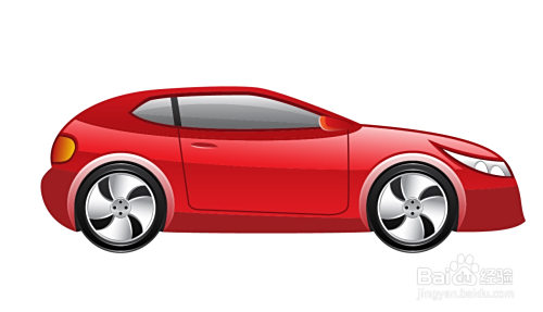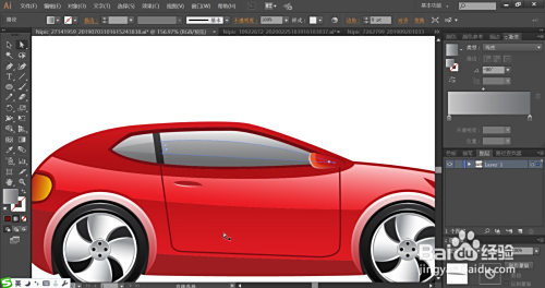 利用暗红色填充车正面的车门的轮廓线,再用暗红色与红白色的渐变搭配填充车门的把手路径。不雅后镜用三种明度分歧的红色的渐变填充前中后三层。