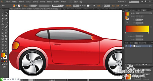 利用两种红白色的渐变填充车轮上面的挡板路径,再用橙黄色的渐变与暗红色搭配填充车后灯的路径。