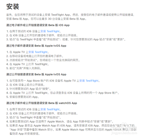 然后再次点击开辟者的公开链接,点击“起头测试应用”,会主动跳转至testflight,点击“安装”即可安装应用