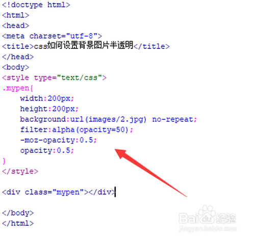 2、在css标签内,设置div的宽度为200px,高度为200px,布景图片为2.jpg,再利用filter、-moz-opacity、opacity属性设置布景图片的透明度为50%,即半透明。