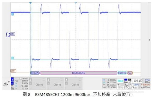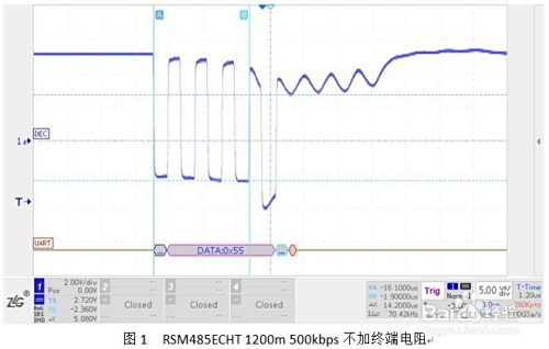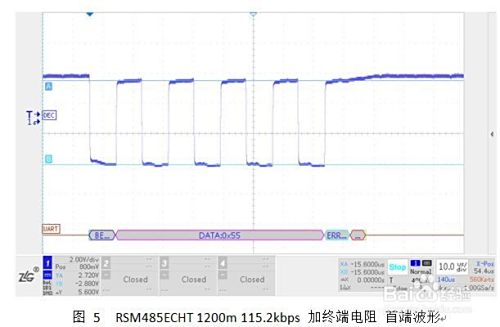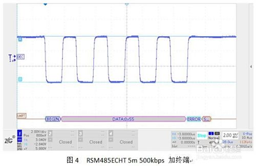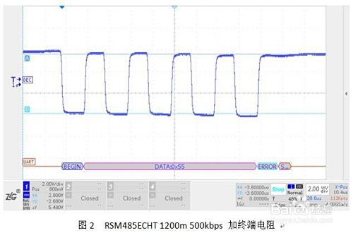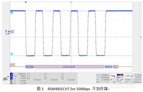 RS-485总线上的负载越大,RS-485收发器输出差分电压幅值越低,RSM485ECHT在5m,500kbps的环境下不加终端电阻下图3所示。
