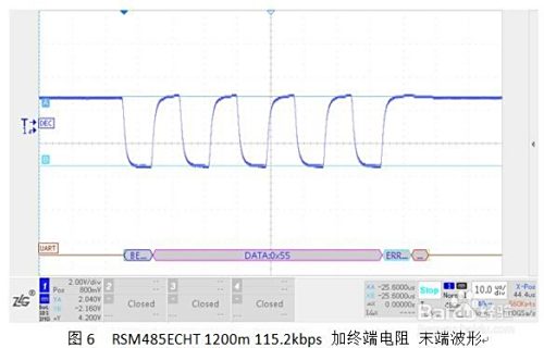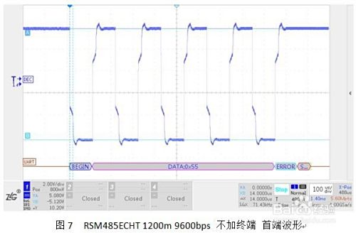 增添终端电阻使通信线缆上的电流增大,发生了较大的压差,降低了领受端的旌旗灯号幅值。RSM485ECHT在1200m,115.2kbps首端和结尾的旌旗灯号波形如下图所示(0.75mm2通信线),结尾旌旗灯号与首端旌旗灯号比拟下降了0.7V摆布。
