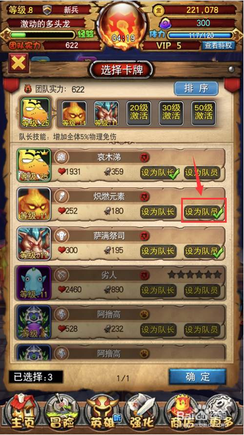 4.可以看到今朝只有三个可用卡牌位置,我们点击炽燃元素卡牌后面的勾,打消在团队中的位置。
