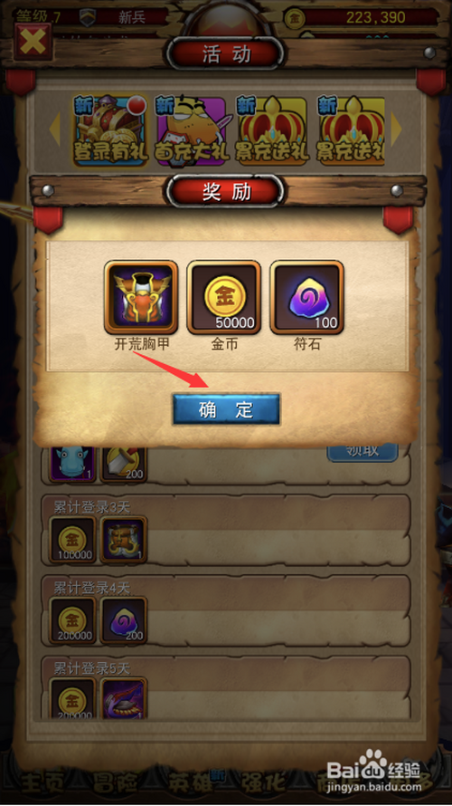 4.点击领取后可查看到具体的奖励物品,点击物品图标可查看物品详情。点击确定获得奖励物品。