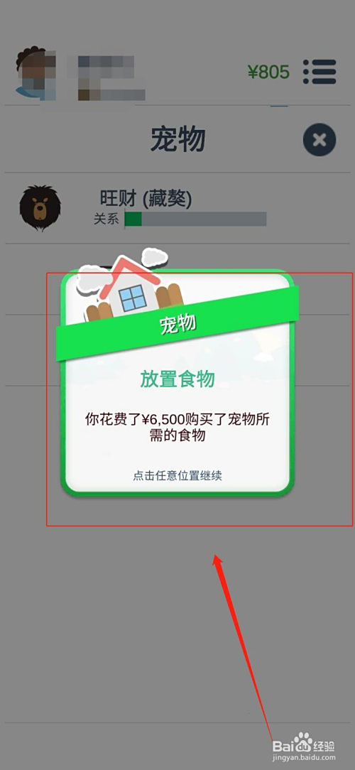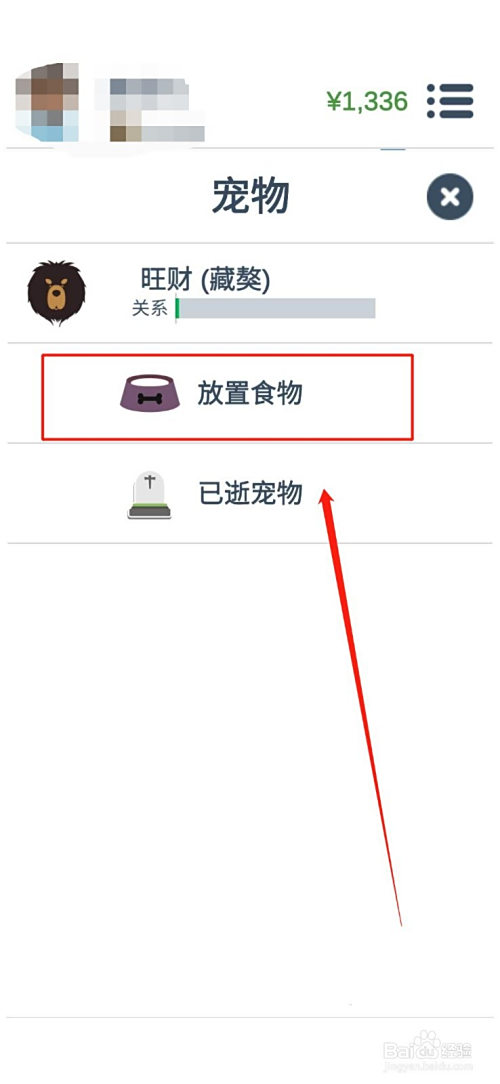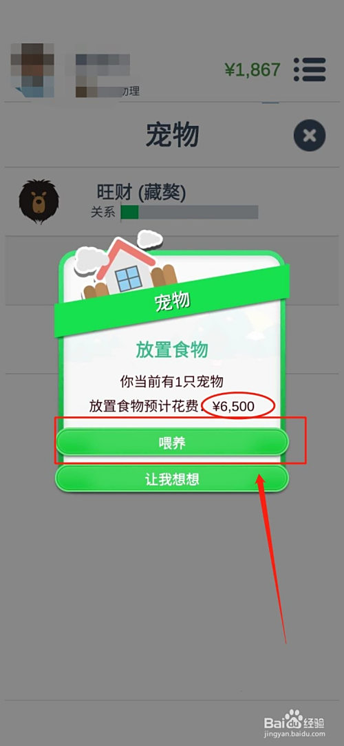 点击位于第一行的“喂养”,如图。(注重喂养宠物是需要花钱的,您买的宠物越贵,您喂养它所花的钱就越贵。请大师稳重考虑豢养宠物的品种。)