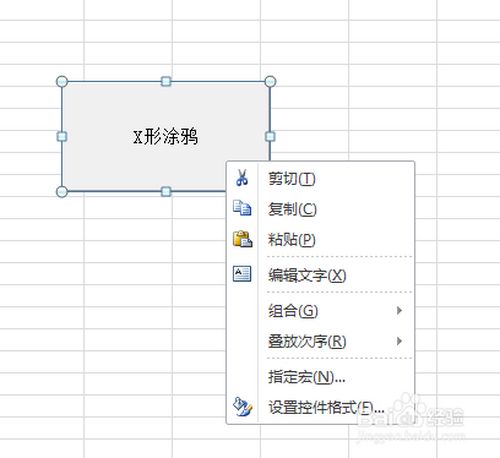 7.将按钮控件定名为“X形涂鸦”,然后点击右键,选择“指定宏”选项。