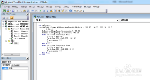 5.在VBA编纂界面,写入指定的VBA代码,然后点击封闭按钮。