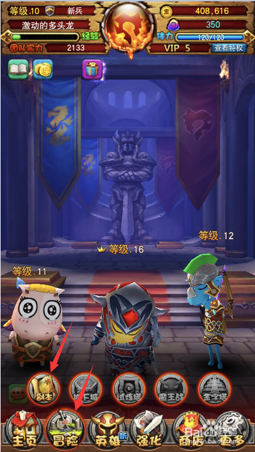 1.点击本家儿菜单冒险,再点击子菜单副本按钮。