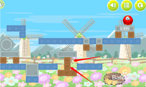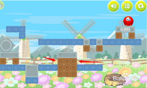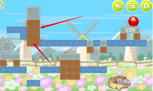 第七步:按照红色箭头,消弭红色小鸟下方木块。