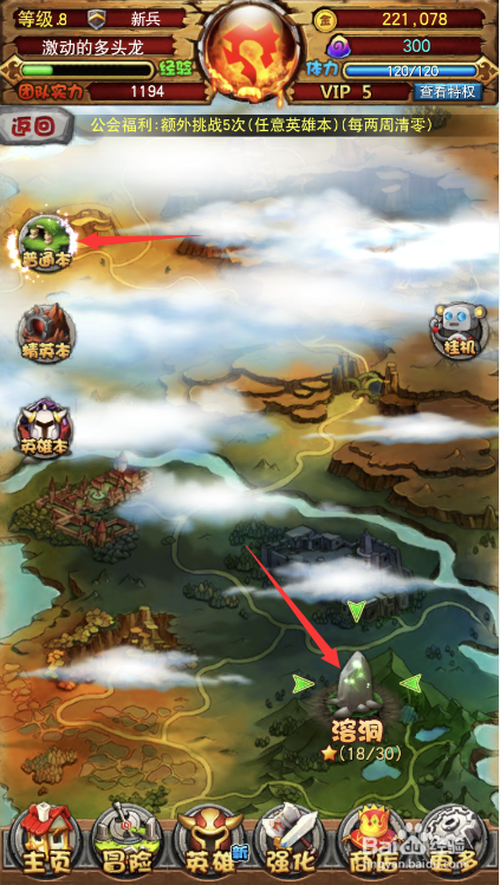 1.点击游戏下方本家儿菜单冒险,再点击子菜单副本。