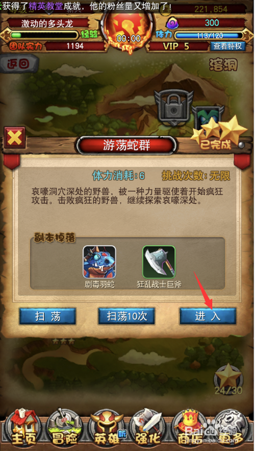 3.点击打开浪荡蛇群副本,点击进入按钮。