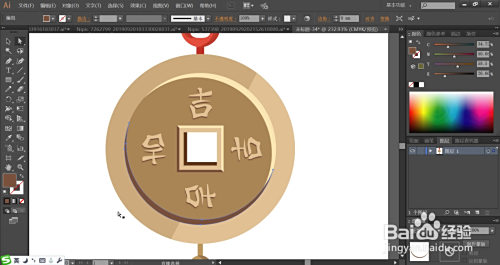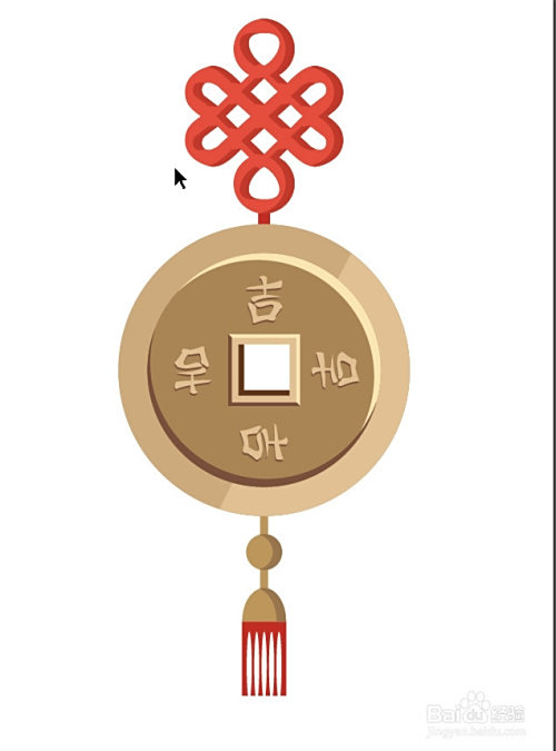 利用钢笔画出中国结的上方网状布局的细节,再用圆形画出货币的根基轮廓,利用文字东西打出文字,再用矩形画出中心的方洞布局,利用钢笔绘制出下方的吊坠细节路径。