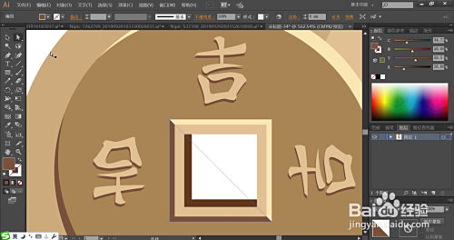 货币中心的孔洞用四种分歧色调的土灰色与灰棕色搭配填充明暗路径,让明暗光线呈现孔洞的立体不雅感。