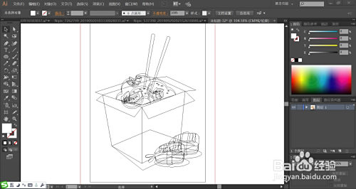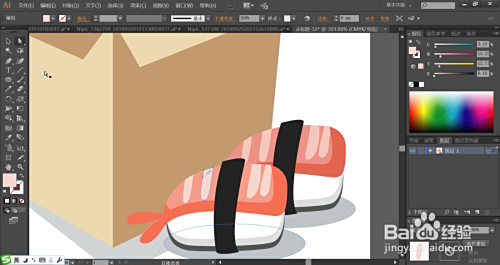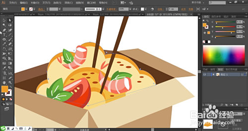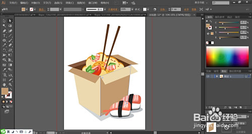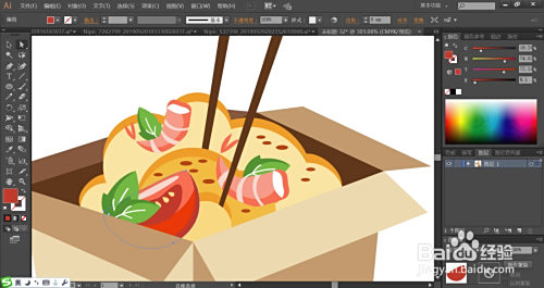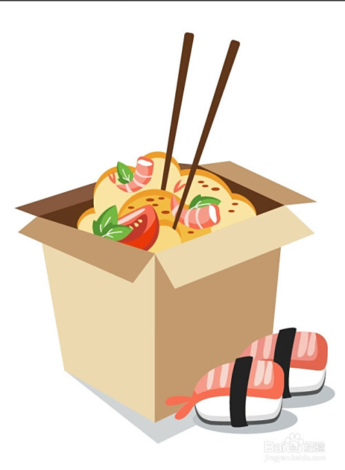利用钢笔画出盒子的左侧面与右侧面,再画出它的顶端启齿分歧侧面的路径,绘制盒子内部的面包、蔬菜、肉块还有筷子,盒子外面的饭团细节路径。