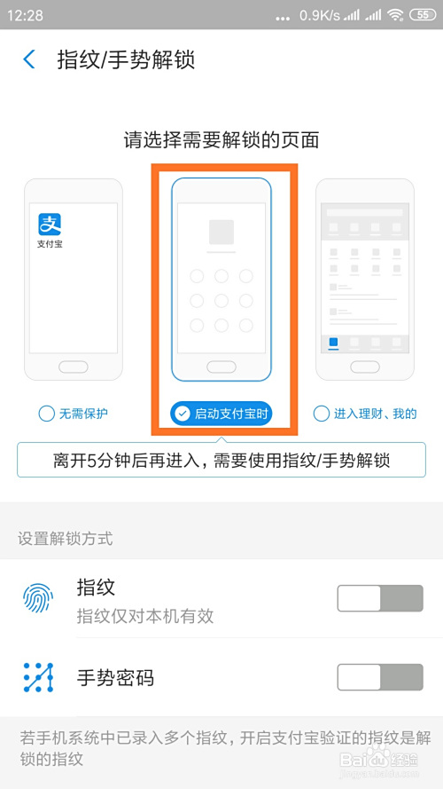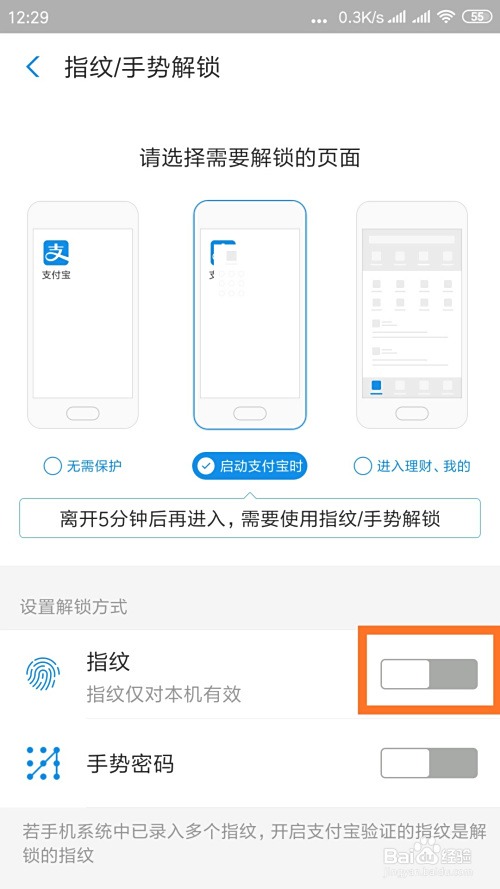 点击图中红框位置处,设置为启动支付宝时需要解锁
