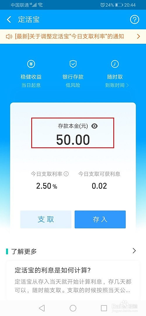 第三步进去网商银行定活宝界面,点击存条目本金,如下图所示: