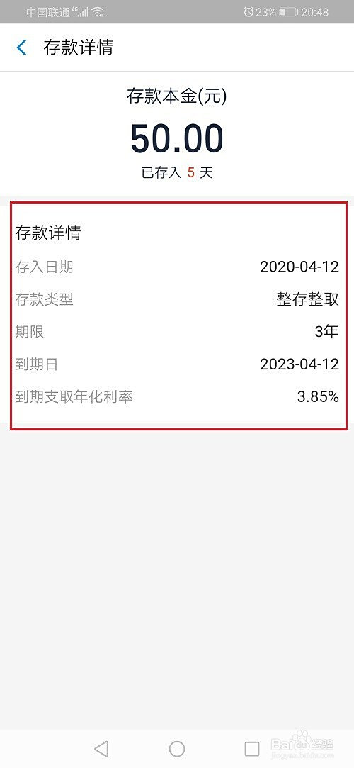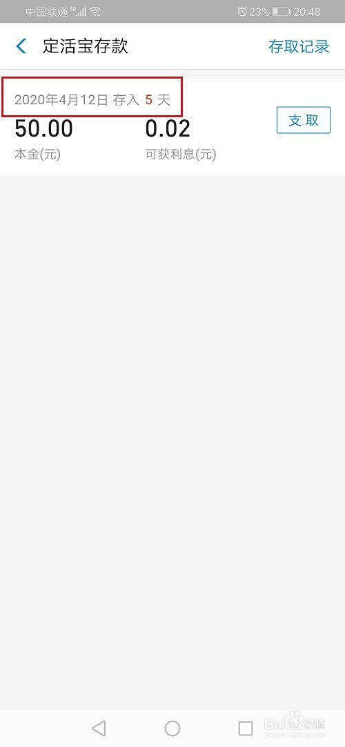 第四步进去之后,可以看到定活宝的存条目日期,如下图所示: