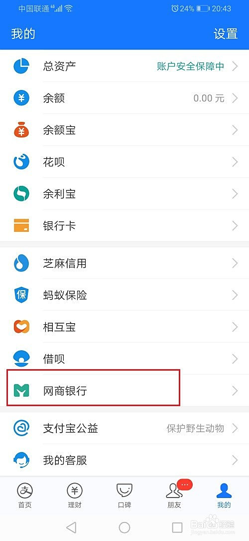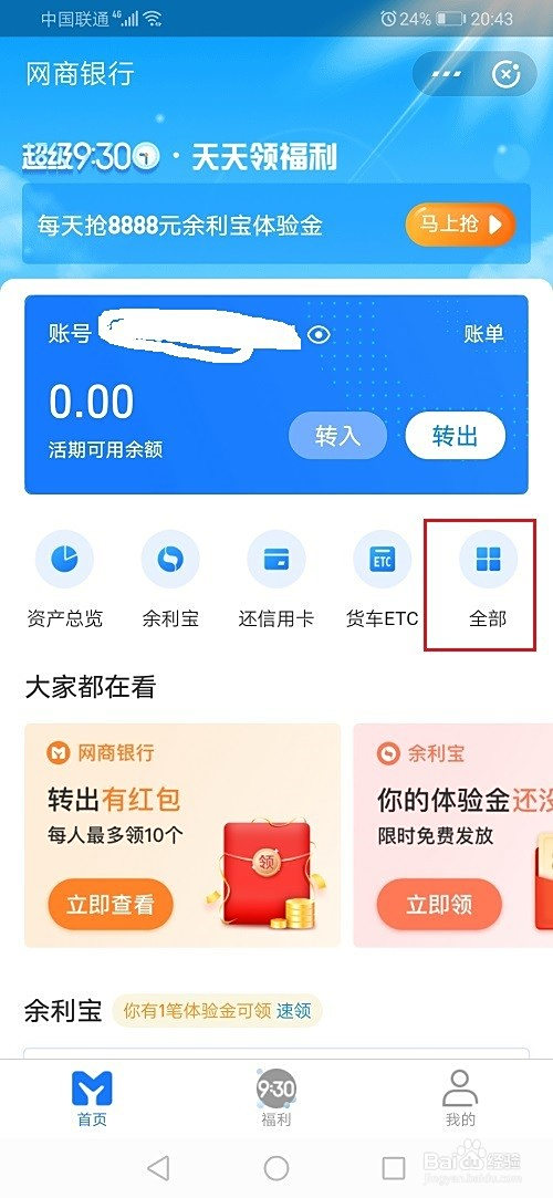 第一步打开支付宝,进去我的界面,点击网商银行,进去首页之后,点击全数,如下图所示: