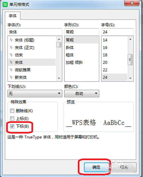 在弹出的单位格格局对话框中勾选下标-确定,如下图所示
