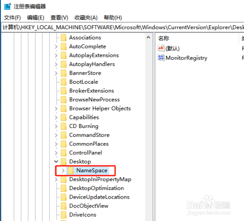 进入注册表之后,我们找到HKEY_LOCAL_MACHINE\SOFTWARE\Microsoft\Windows\CurrentVersion\Explorer\Desktop\NameSpace文件夹,如图。