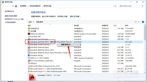 在程序和功能界面找到CAD2014,右击选择卸载/更改.点击完当作.如下图所示.