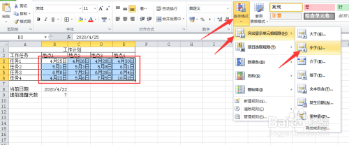 选入彀划的日期,依次选择起头菜单下的:前提格局-凸起显示单位格法则-小于