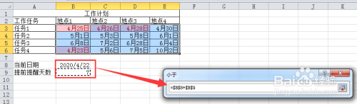 输入公式,将当前日期和提前提醒天数乞降,然后完当作框选。