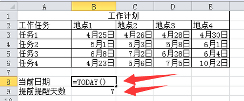 在打算表格中增添两个信息,当前日期输入公式=dotay(),用于每日打开Excel时即主动更新当前日期,提前提醒天数按需要填写。