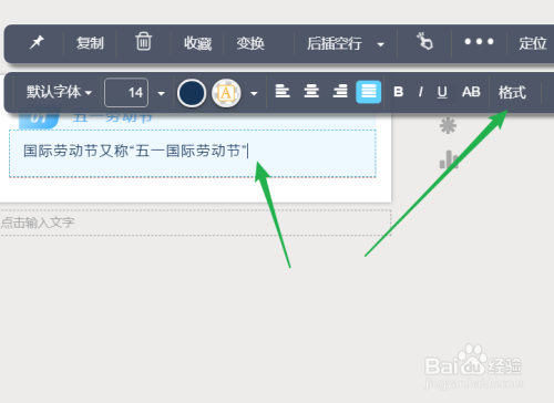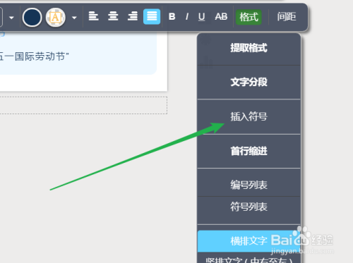 利用左侧样式进行排版或者输入文字,选中需要插入符号的处所,将光标放到此处,点击【格局】。