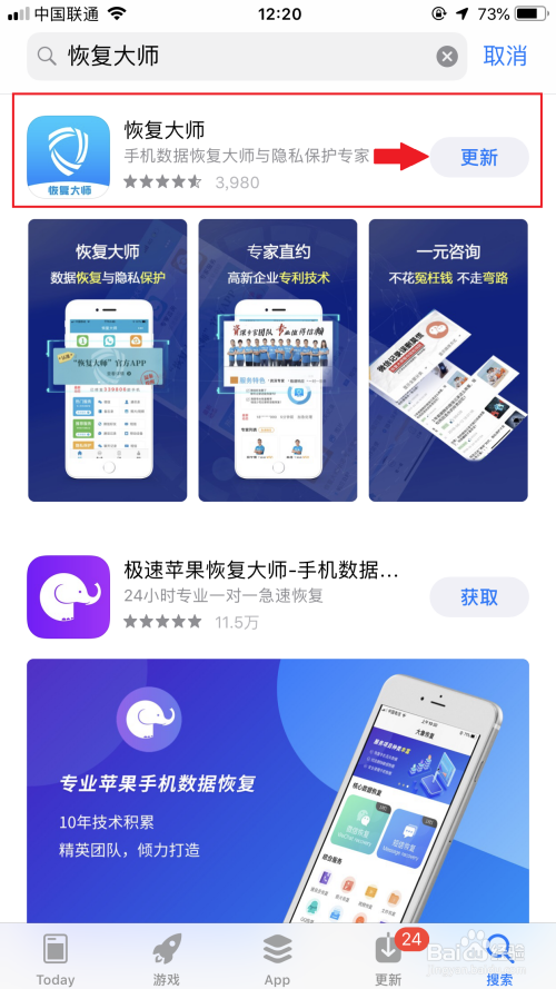 打开苹果应用商铺,下载“恢复巨匠”,选择聊天记实修复