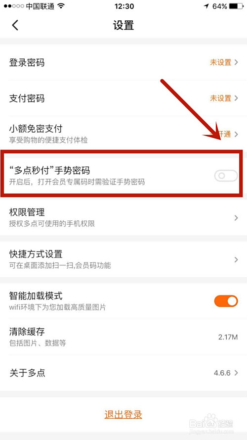 2.点击设置,再点击打开多点秒付手势暗码后的按钮。