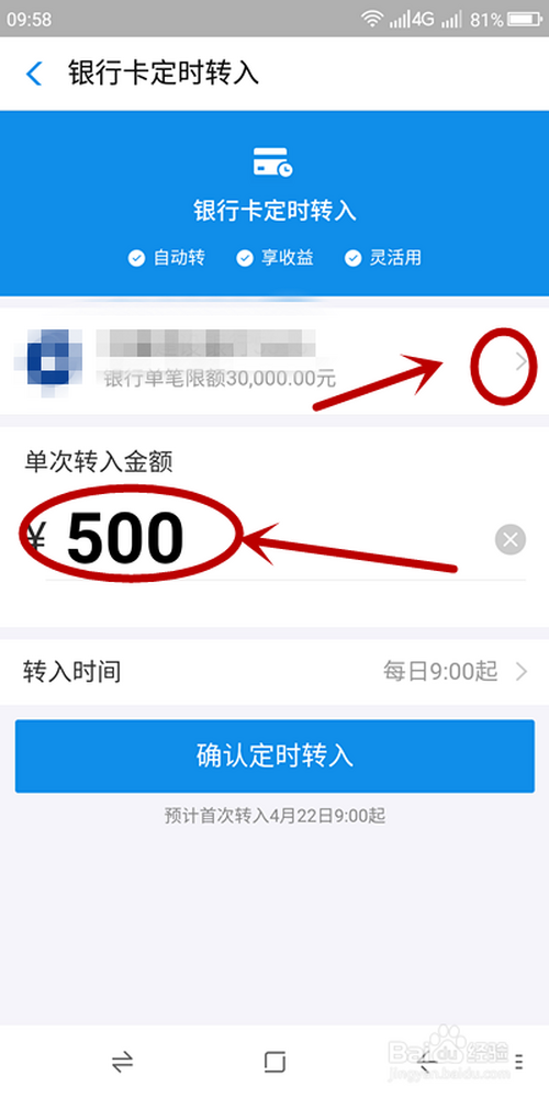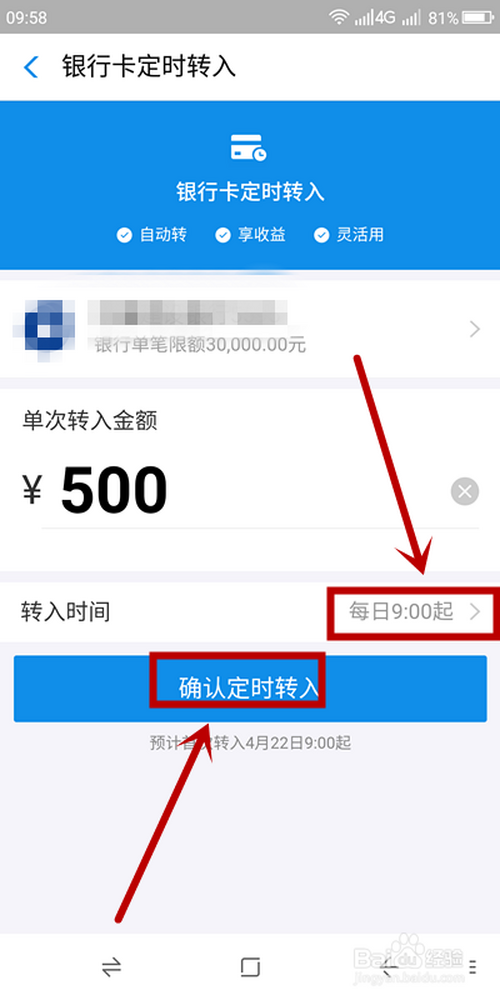 进入【银行卡按时转入】页面后,选择转入银行卡、设置金额