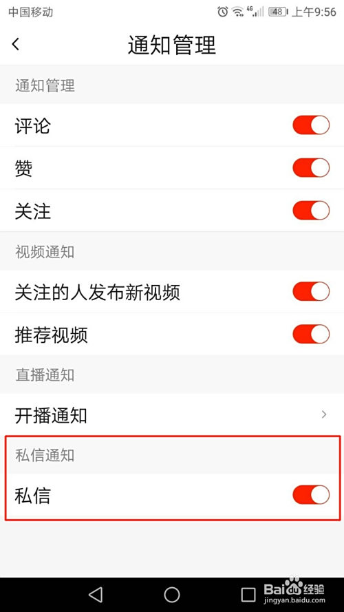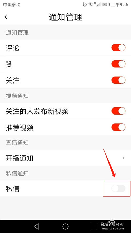 若是需要封闭私信通知功能,则点击红色开关,使其变为灰色即可。